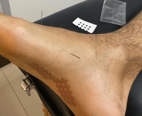 Podemos observar na imagem referente ao tratamento de fascite plantar através da associação de laserterapia+acupuntura+spiral taping + fisioterapia , proporcionando efeito analgésico e anti-inflamatório.