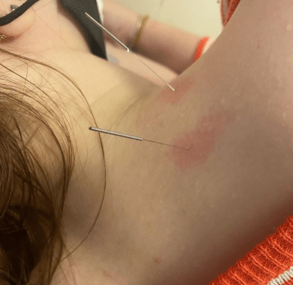 Alguns pacientes que realizam acupuntura apresentam esta coloração vermelha em volta do ponto de acupuntura logo após a aplicação , mostrando uma ótima reação do organismo, sendo que ao término da sessão esta coloração desaparece.